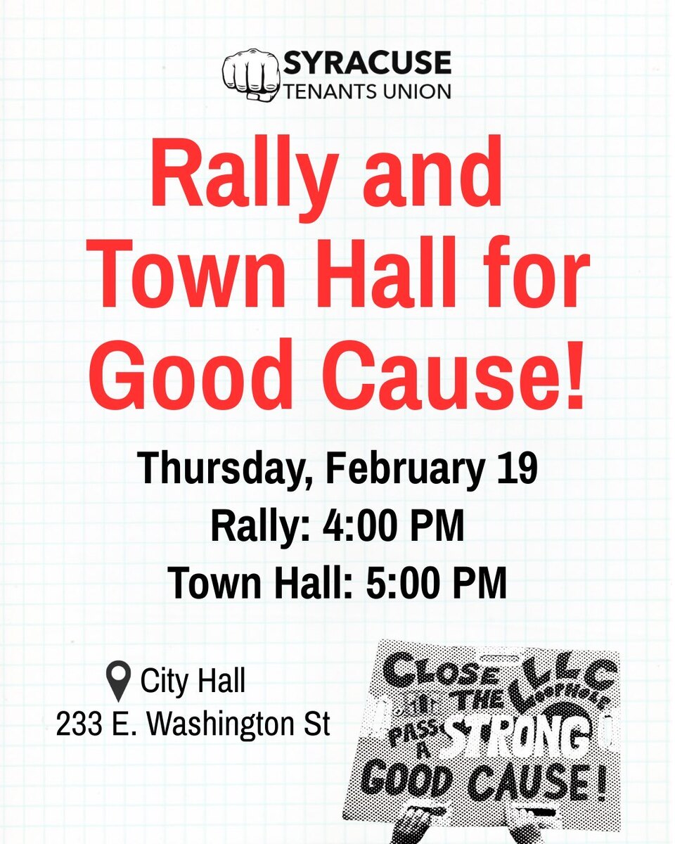 With just 48 hours notice, at the request of landlords, Council has scheduled an extra public meeting on Good Cause. These protections would limit rent hikes and protect lease renewals for about 50,000 Syracuse residents. Landlords want to stop them.